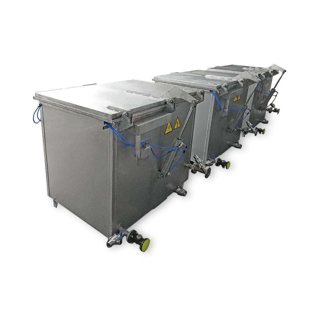 Water or brine cookers (cooking vats) featuring a vertical opening design and pneumatic door mechanism. Built entirely from AISI 316 stainless steel, ensuring efficient performance through digital control and indirect steam heating.