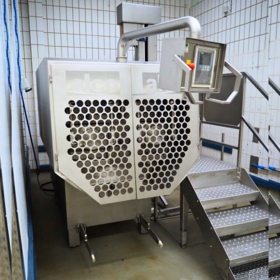 Industrial kneading and mixing line for the meat processing industry consisting of an ALCO Food Machines AMP 1600 double shaft mixer, a Carnitech mobile bin lifter for 200 liter meat bins, a stainless steel working platform and standard meat bins.