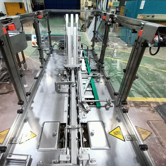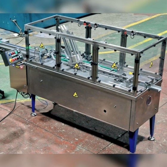 The operating cycle begins with controlled container accumulation. A suction cup lever extracts the tubular sleeve (pre-formed but open on the sides) and positions it in parallel with the product flow. A synchronized pusher system introduces each can laterally into its sleeve as they move forward continuously. Finally, the exact dose of Hot Melt glue is injected into the flaps, and guides fold the side closures, achieving a firm, clean, and aesthetically impeccable seal.