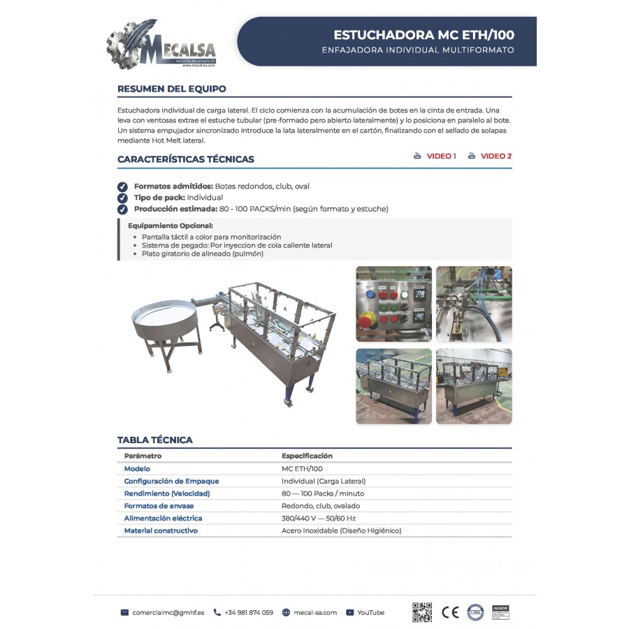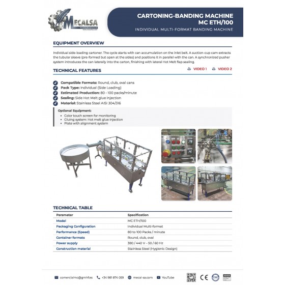 The MC ETH/100 is the ultimate industrial solution for individual can cartoning. Its multi-format design allows it to process round, club, and oval containers with equal efficiency, making it a key component for canning lines that require maximum flexibility.