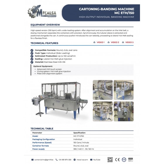 The MC ETH/150-PAL represents a robust and precise solution for the cartoning of Club formats (RR-90 / RR-125) in groupings of two units. Its design is distinguished by the use of pre-formed "tube" cases that allow for lateral product insertion, providing a more resistant and protected package structure.