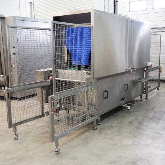 Meat Bin Washer P-M-B Hygiene Technik with automatic infeed and outfeed lifter, designed for efficient cleaning of meat bins in industrial environments. This machine is ideal for maintaining hygiene in food production processes.