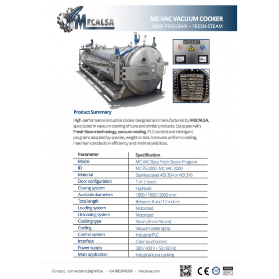 This industrial steam vacuum cooker is designed for the efficient and precise cooking of tuna and other seafood products. Built entirely in stainless steel (AISI 304/316), it features a robust and hygienic structure ideal for the food processing industry.