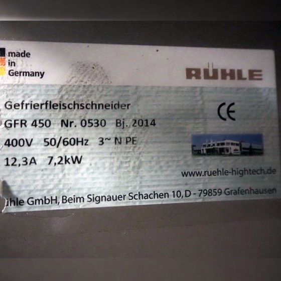 The Rühle GFR 450 (serial 0530, built in 2014) is designed to cut frozen blocks of meat, fish, fruit or vegetables at –20 °C. It features strong performance with 7.2 kW power, 480 mm working width, and 90 mm knife spacing.