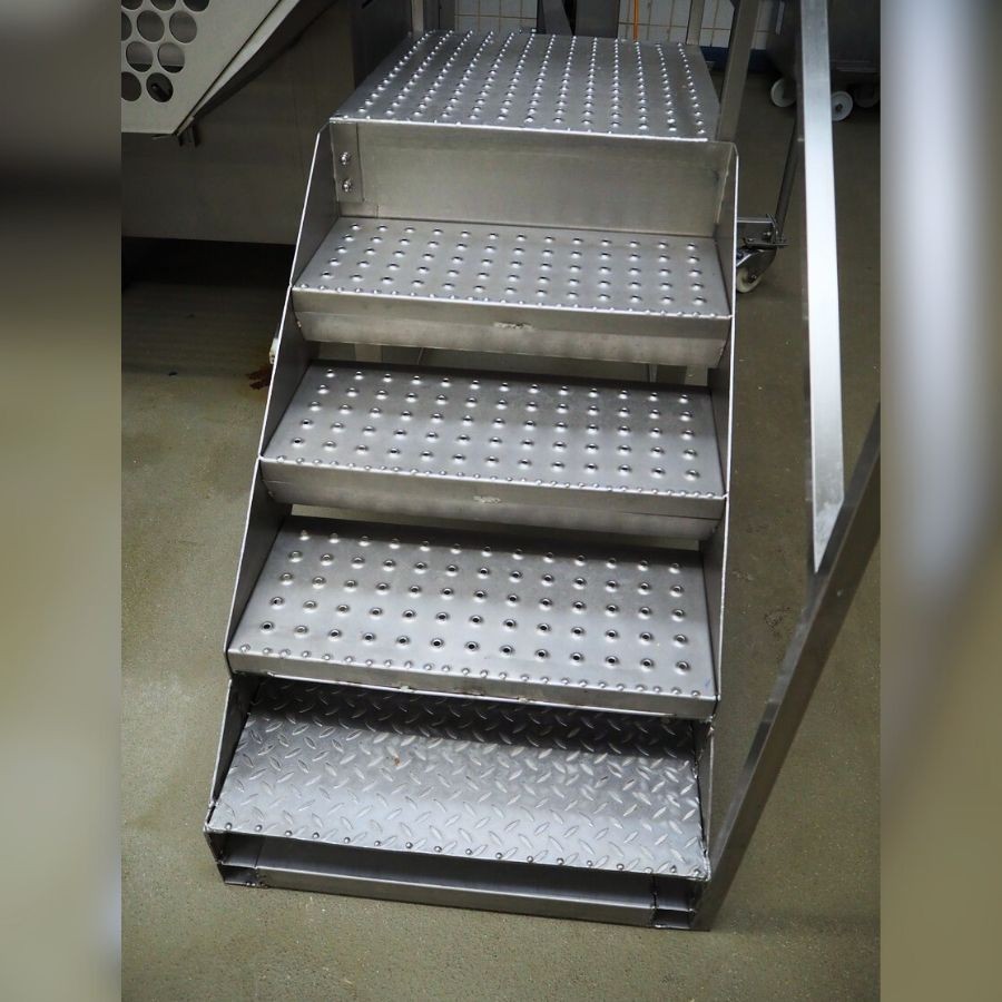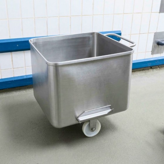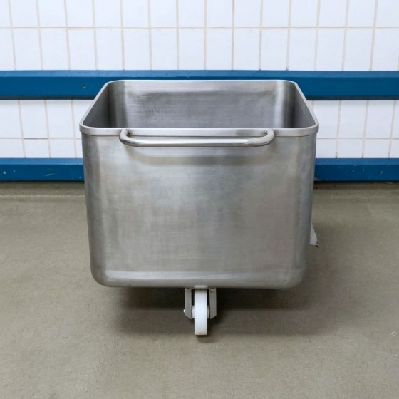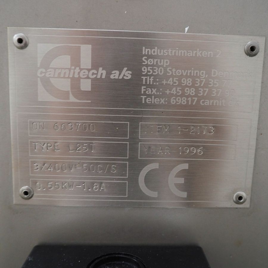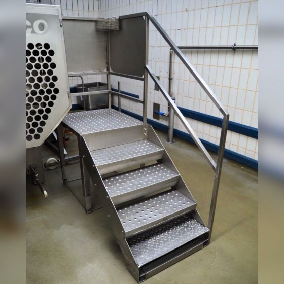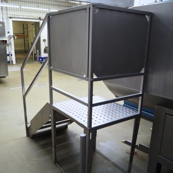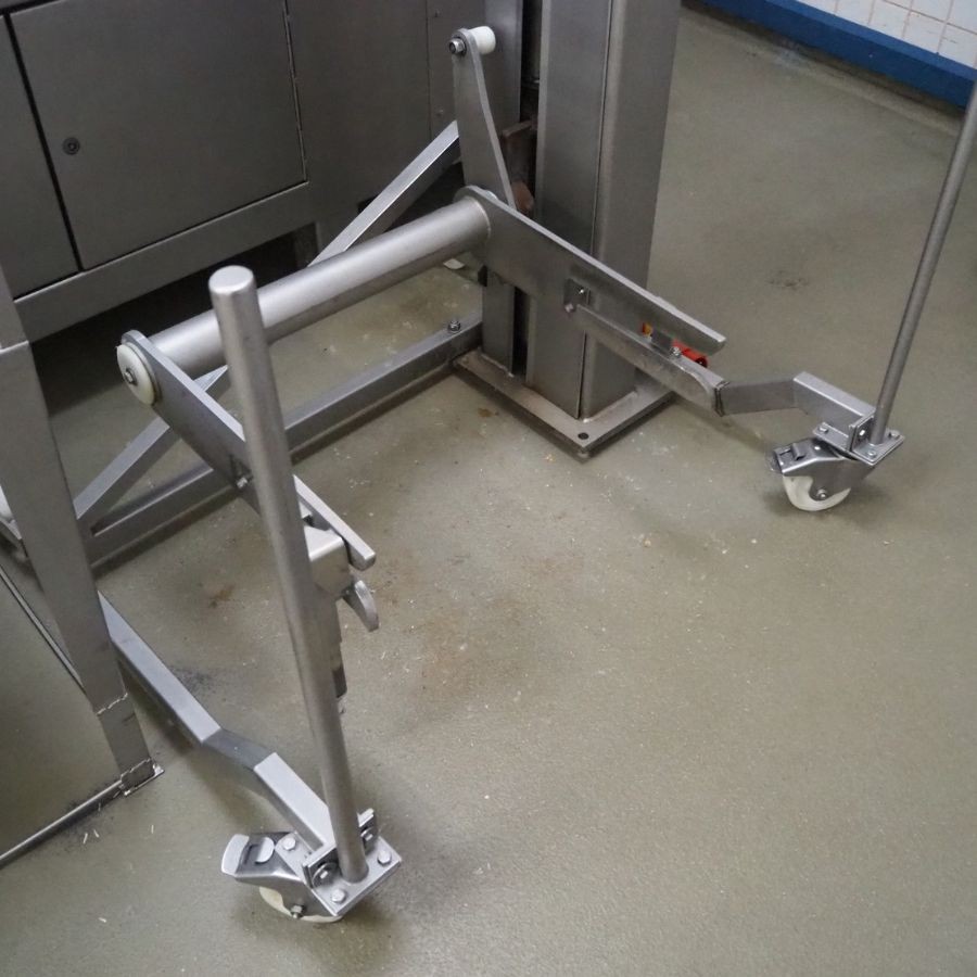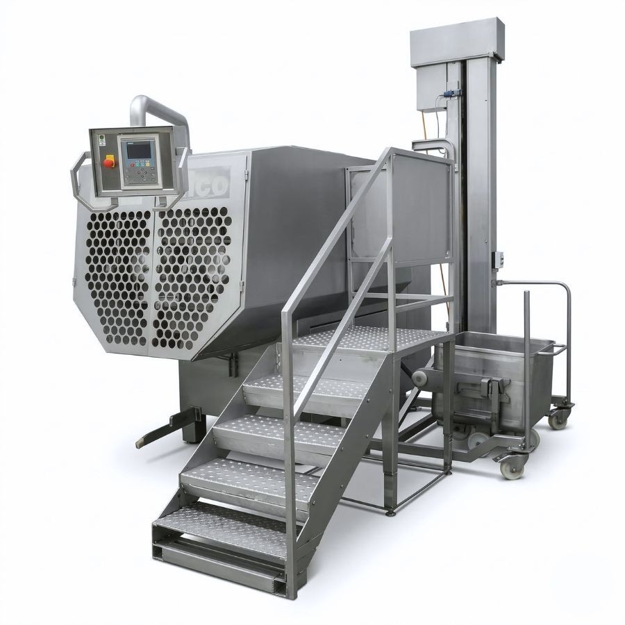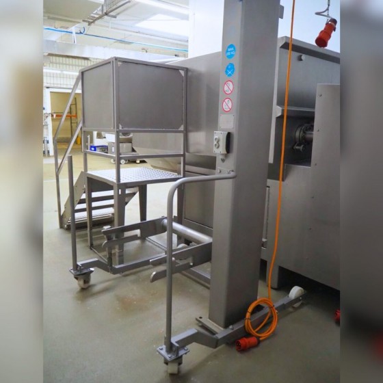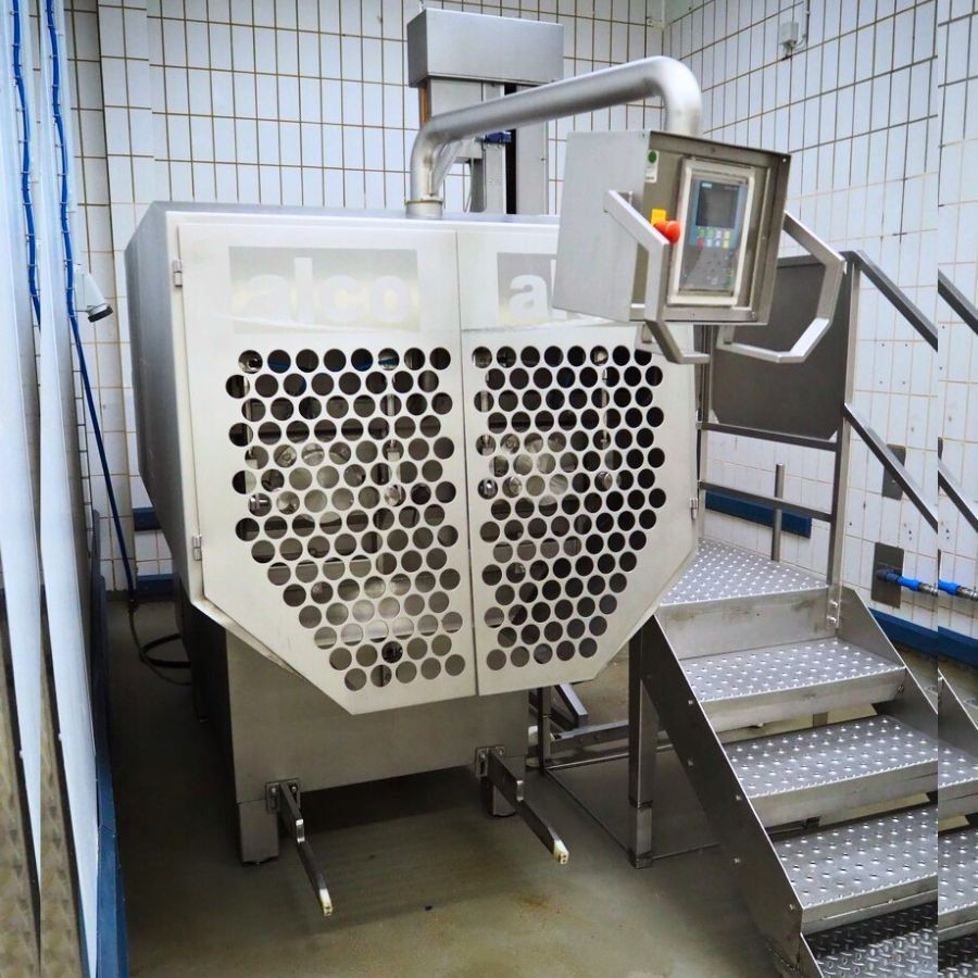 Complete mixing line designed for meat and food processing plants, consisting of an ALCO Food Machines AMP 1600 double shaft mixer, a Carnitech mobile bin lifter, a stainless steel working platform and standard 200 liter meat bins.