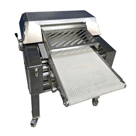 Empanadora industrial Koppens PR 900 equipada con una cinta de malla de acero inoxidable, ideal para procesos de empanado en la industria alimentaria. Fabricada para ofrecer rendimiento y durabilidad.