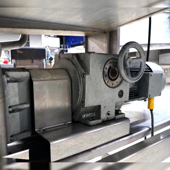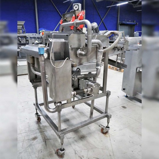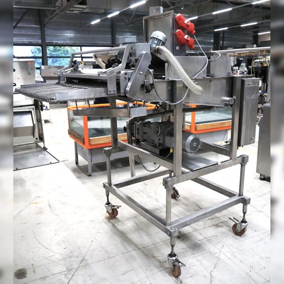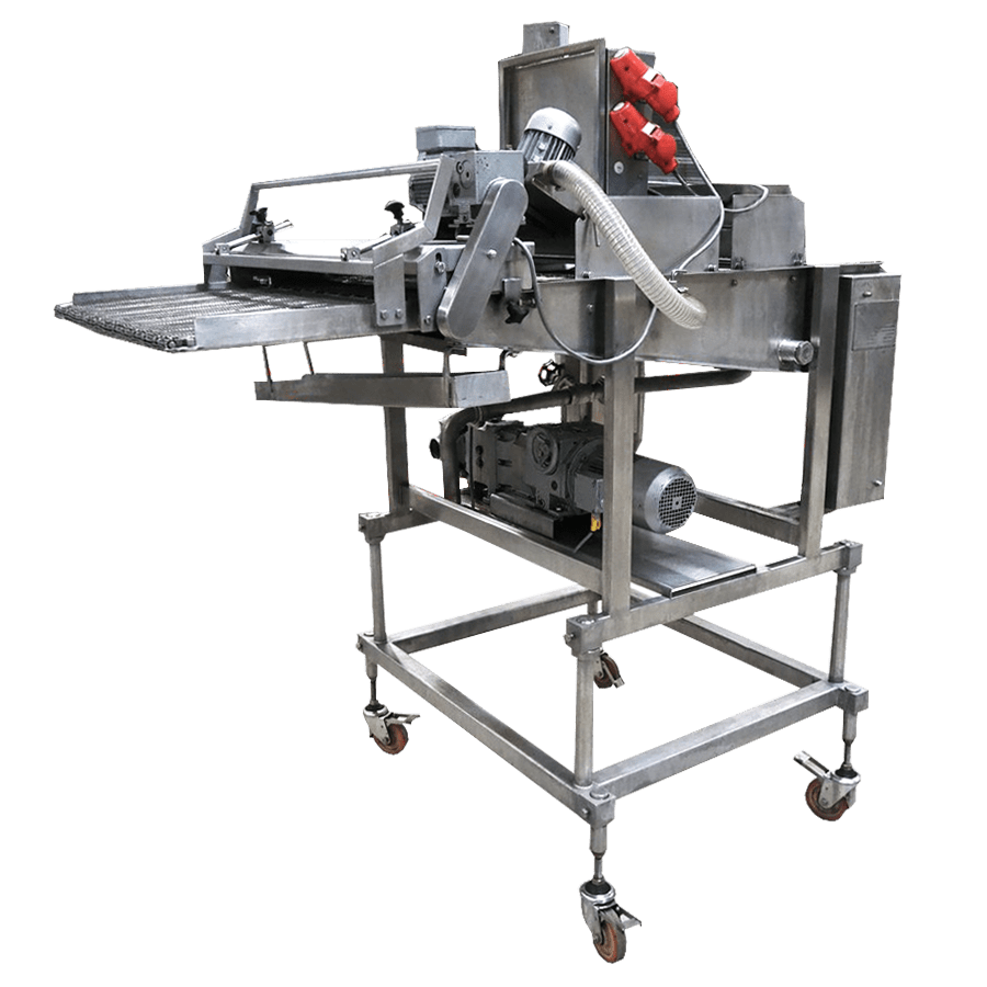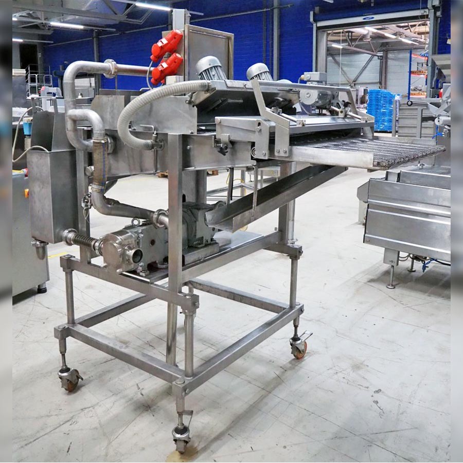 Encoladora móvil Koppens ERT 900, diseñada para aplicar recubrimientos líquidos uniformes a productos alimentarios. Esta máquina proporciona una solución eficiente y confiable, fabricada en acero inoxidable para cumplir con los estándares de higiene industrial.