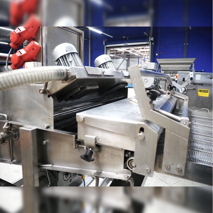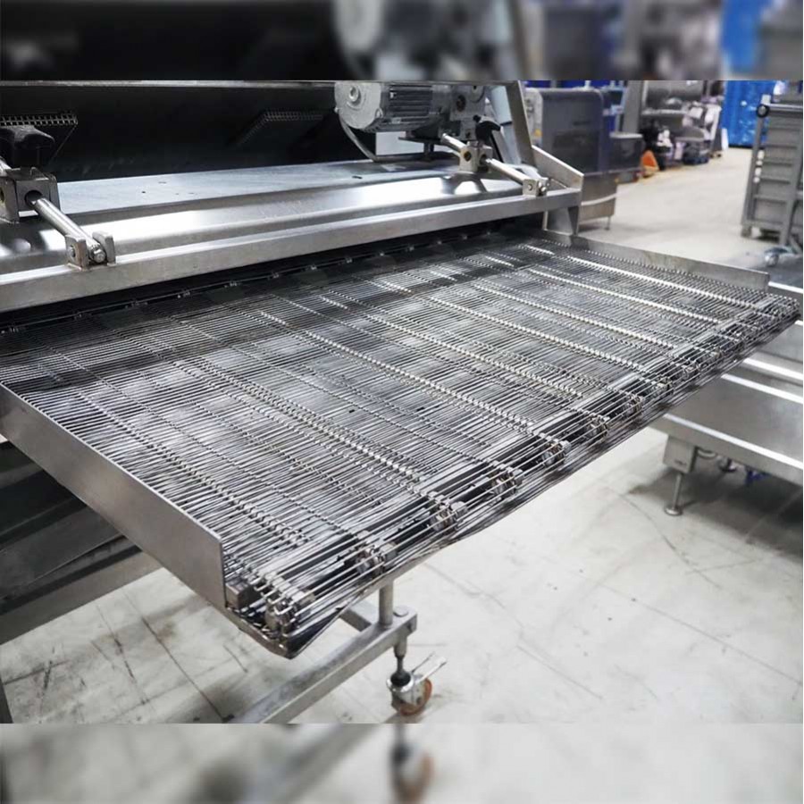 Encoladora móvil Koppens ERT 900 equipada con una cinta de malla de acero inoxidable, ideal para procesos de encolado en la industria alimentaria. Diseñada para ofrecer eficiencia y durabilidad.