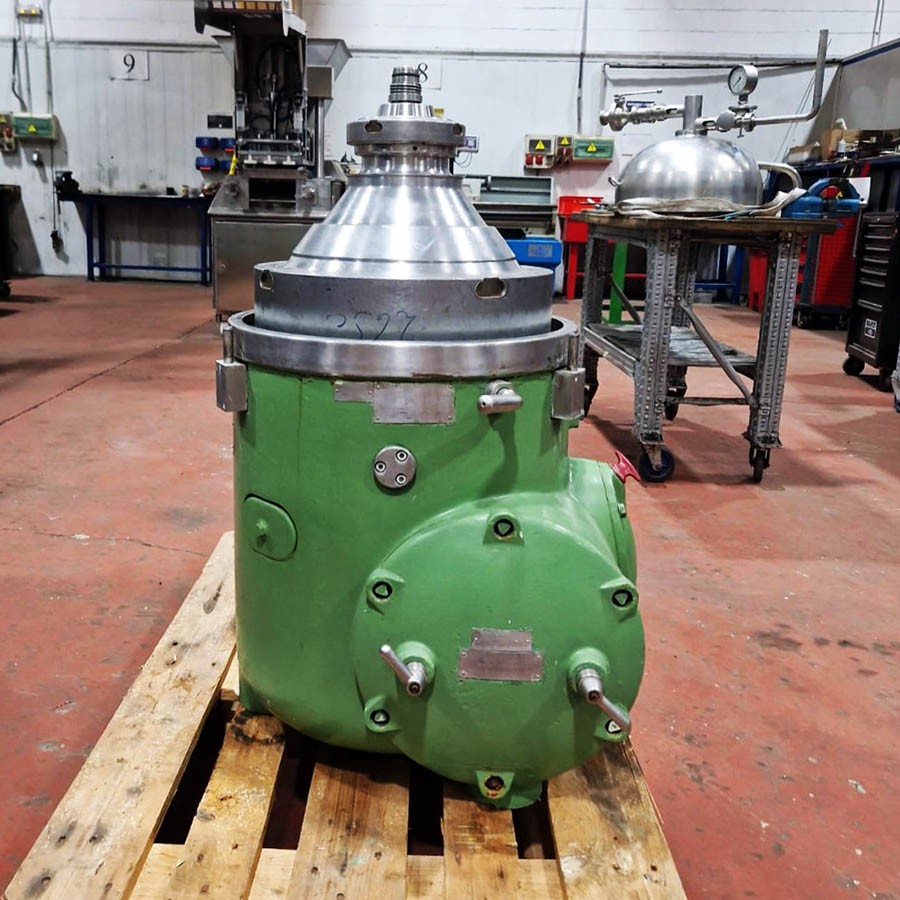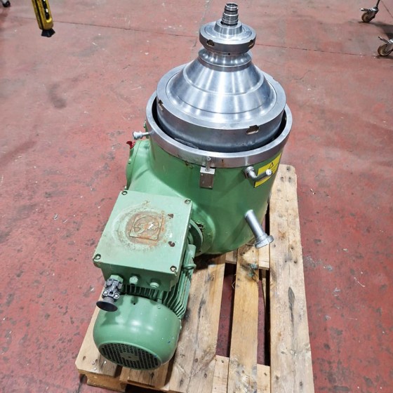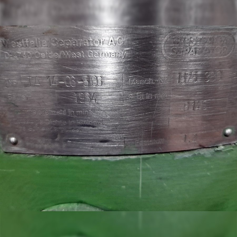 El Westfalia TA 14‑06‑506, n.º de máquina 1675 380 (año 1984), es un separador centrífugo con cuenco sólido de acero inoxidable 316, ideal para clarificación de líquidos con descarga presurizada. Montado sobre bastidor fijo, incluye repuestos listos para instalar.